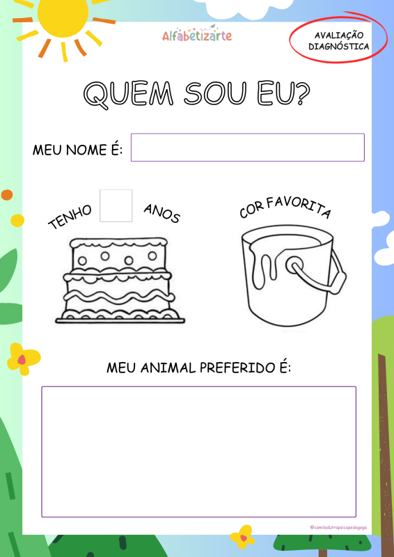 A atividade “Quem sou eu?” é uma proposta lúdica e investigativa cujo objetivo é observar e registrar conhecimentos prévios que a criança já possui no início do processo de intervenção ou do ano letivo. Por meio dela, é possível avaliar de forma leve e significativa noções básicas relacionadas à linguagem, matemática e aspectos pessoais e familiares. Essa proposta diagnóstica é rica em possibilidades porque permite à criança se expressar de forma pessoal e natural, ao mesmo tempo em que oferece ao educador ou terapeuta pistas valiosas sobre o nível de desenvolvimento em diferentes áreas do conhecimento.